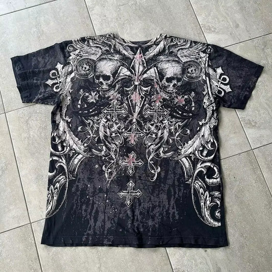 Streetwear Y2K Affliction T Shirts Hip Hop Tee Gothic Skull Cross Print round Neck Oversized Short Sleeve Trendy Graphic Tshirts